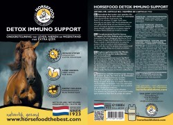 De Horsefood Detox Immuno Support is ter ondersteuning van de lever, nieren en weerstand. De lever en nieren spelen een belangrijke rol in de afvoer van gif- en afvalstoffen. Deze organen hebben ook effect op de hormoonhuishouding en stofwisseling van een paard. Tijdig een detox kuur is belangrijk voor de lever- en nierfunctie. Speciaal voor paarden die moeten aansterken na zware inspanning, na medicatie gebruik, bij paarden met metabole stoornissen, obesitas of bij herstel. Bevat sorbitol, een anti-oxidant en extracten. Daarnaast ook ijzer en een hoge dosis vitamin B-complex voor een optimale weerstand op natuurlijke wijze.